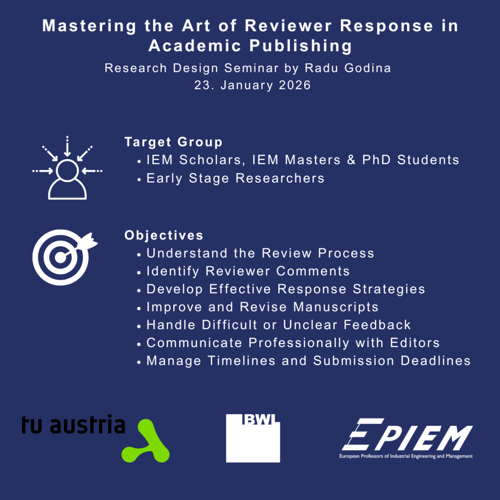 The inter-university EPIEM seminar, “Mastering the Art of Reviewer Response in Academic Publishing”, will take place on January 23, 2026, at TU Graz, hosted by the Institute of Business Economics and Industrial Sociology (TU Graz).